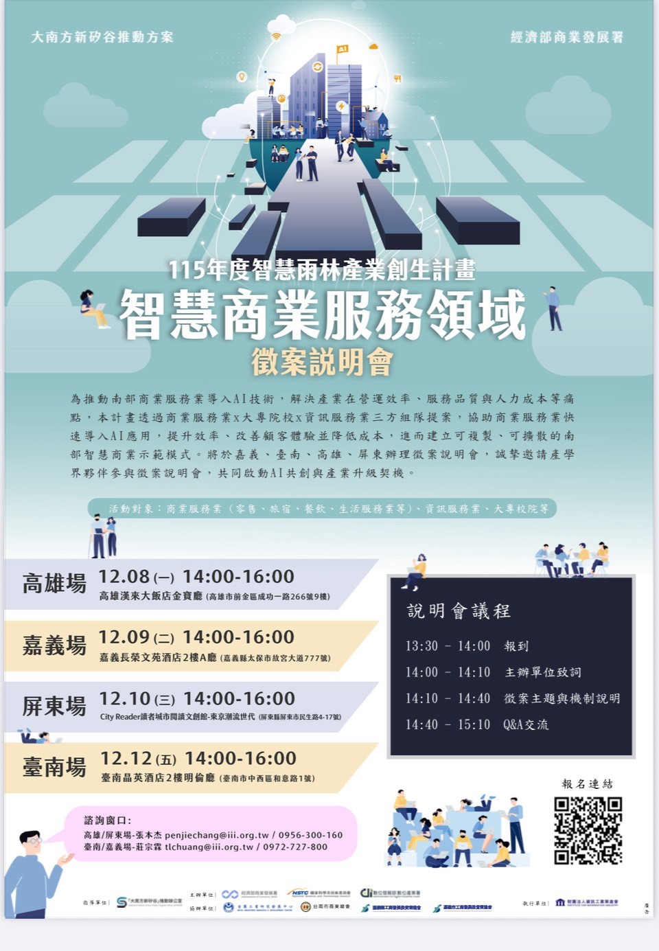 【資訊分享】12/9 經濟部商業發展署「115年智慧雨林產業創生計畫-智慧商業服務領域」徵案說明會 (嘉義場)(免費參加)