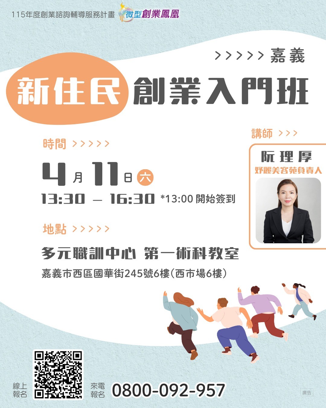 【資訊分享】4/11 勞動部勞動力發展署雲嘉南分署「微型創業鳳凰-創業入門班/新住民專班」(免費參加,額滿截止)